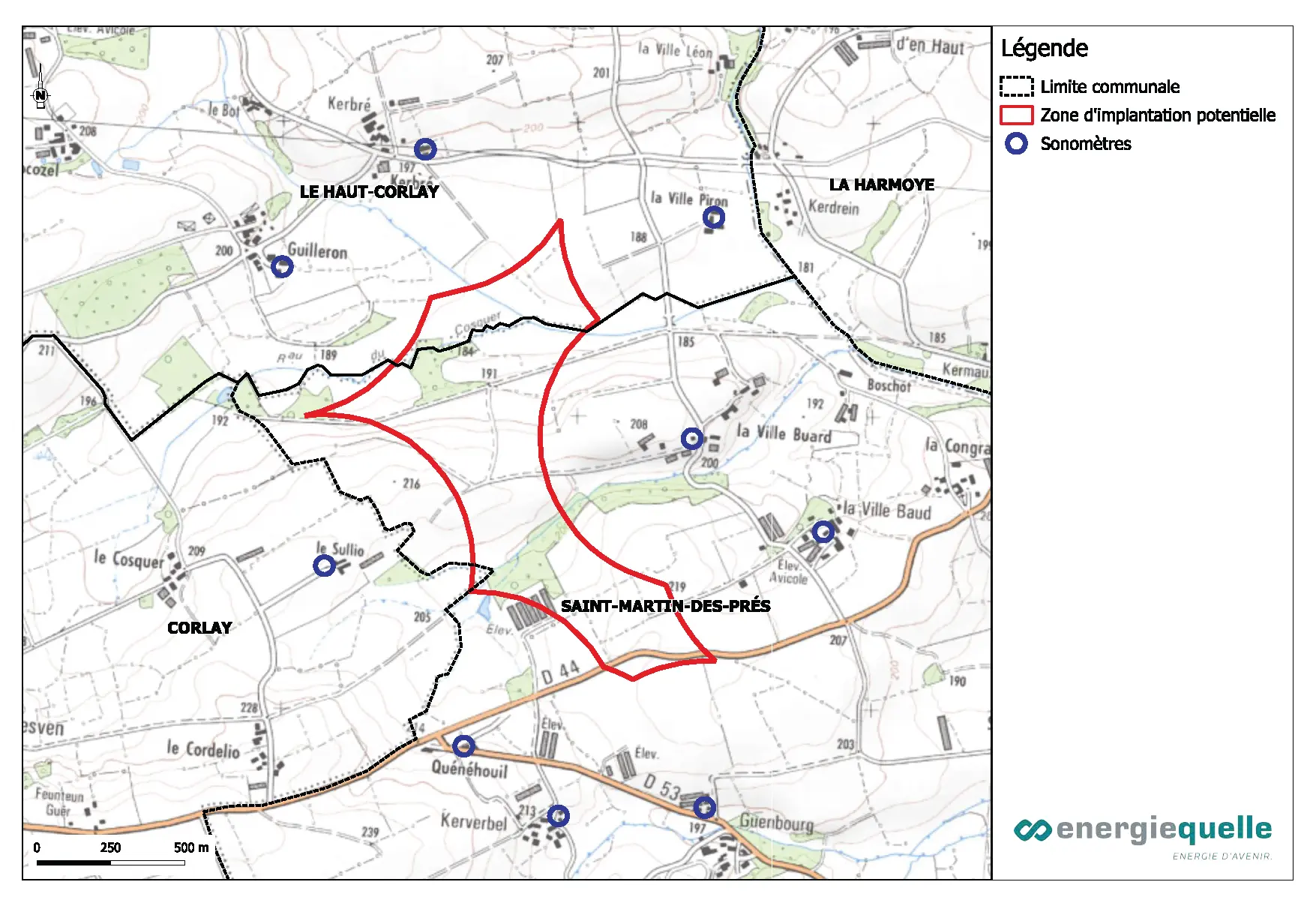 9 points de mesures acoustiques répartis autour de la zone étudiée à proximité des habitations ont permis d’enregistrer en continu les ambiances sonores durant 15 jours du 10 au 24 septembre. Cette période représentera l’ambiance sonore en période végétative. Une seconde campagne hivernale est prévue avant la désinstallation du mat. Cet état initial sonore, corrélé aux mesures issues de l’étude de vent et aux données techniques de différents modèles d’éolienne étudiés a permis au bureau d’étude EREA de vérifier en amont le respect de la réglementation acoustique française. S’il apparait un risque de non-conformité à cette réglementation, le fonctionnement des éoliennes serait alors adapté de façon à réduire l’émergence sonore émise par ces dernières.