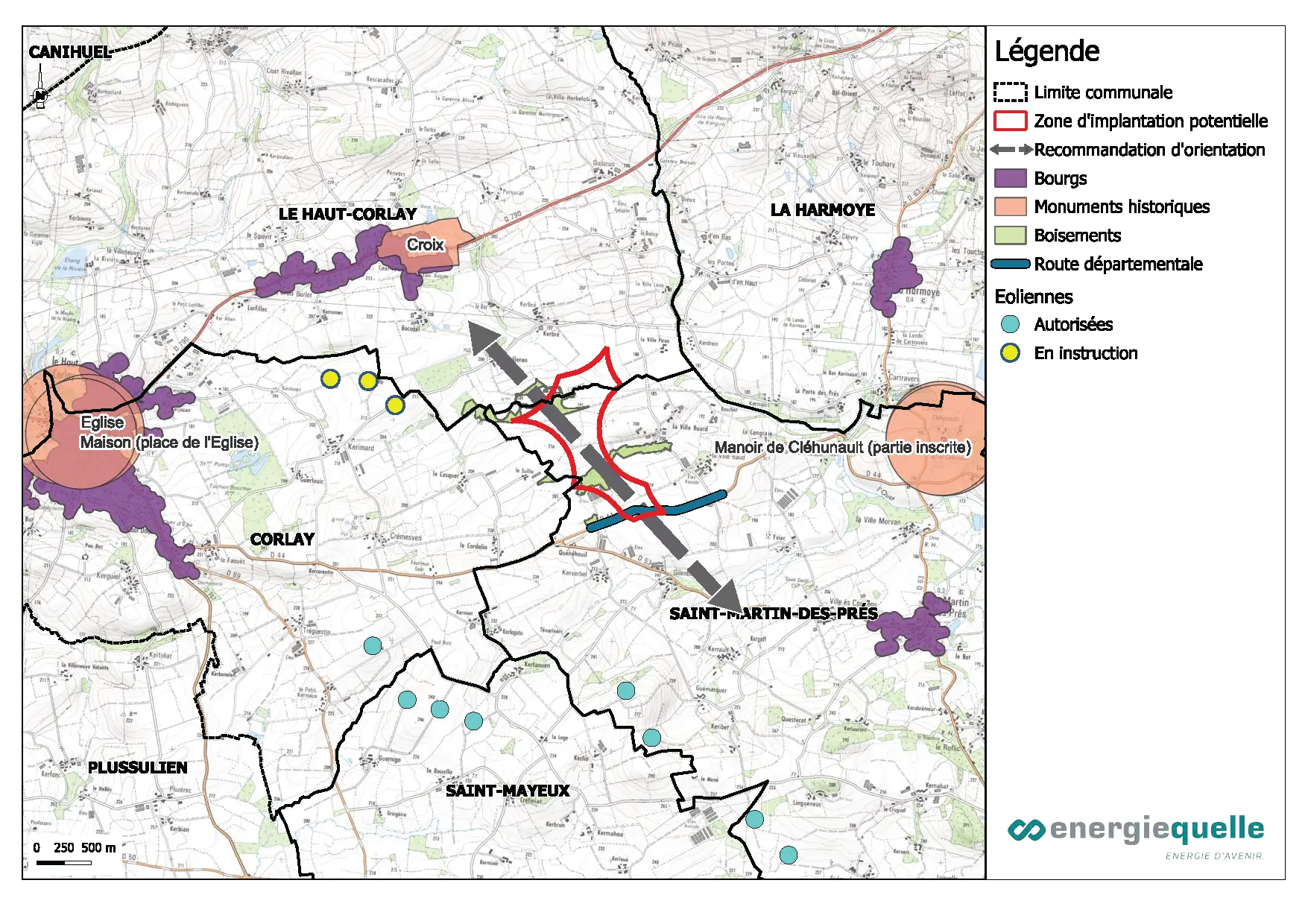 - Il est préférable de privilégier une implantation linéaire, avec une ligne unique d’éoliennes, afin d’alléger le motif paysager, d’en améliorer la lisibilité et de s’inscrire en cohérence avec le parc éolien existant de Saint-Martin-des-Près, selon une orientation nord-ouest / sud-est.