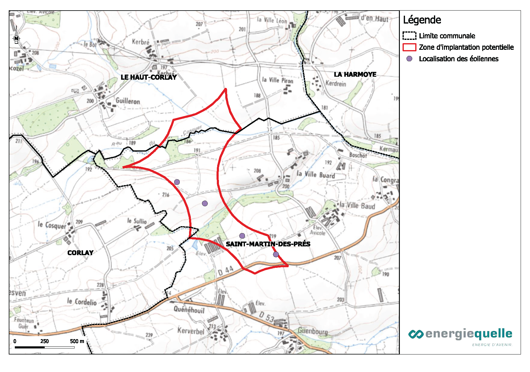 - S’éloigner de la route départementale D44 et des fermes au tour de la zone d’implantation potentielle afin d’éviter un angle d’occupation trop important et une prégnance des éoliennes.